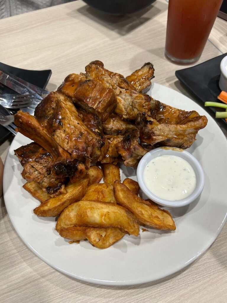 Gastronomía: Especializado en alitas y costillas, Wings & Ribs destaca por sus generosas porciones de alitas (disponibles en paquetes de 10, 20 y 30 piezas) y costillas de cerdo a la BBQ, acompañadas de salsas caseras que van desde sabores clásicos picantes hasta opciones ahumadas. También ofrecen boneless, hamburguesas (como la de sirloin prensado con queso y tocino) y papas a la francesa, que son populares como acompañamiento. La comida es sabrosa, con un enfoque en satisfacer antojos de comida americana con un toque local.